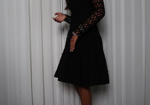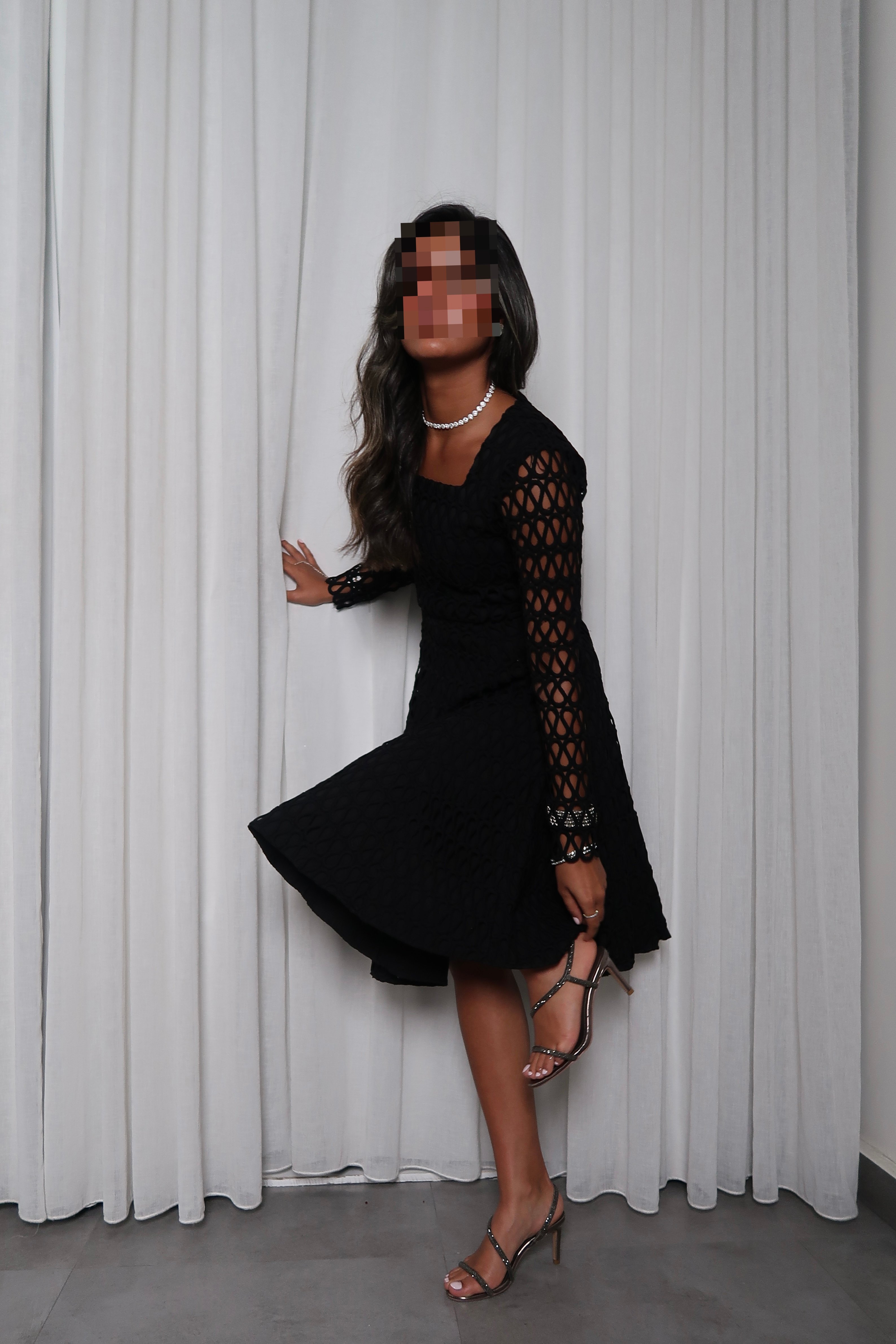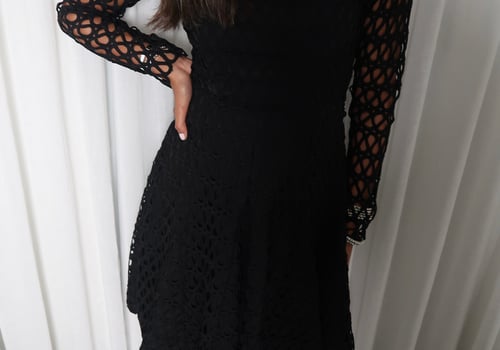 Black dress with unique textured embroidery and a flattering square neckline. Features long sleeves and a soft, flowy silhouette that adds elegance to any look.