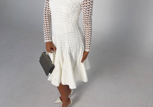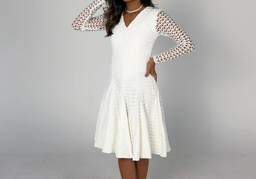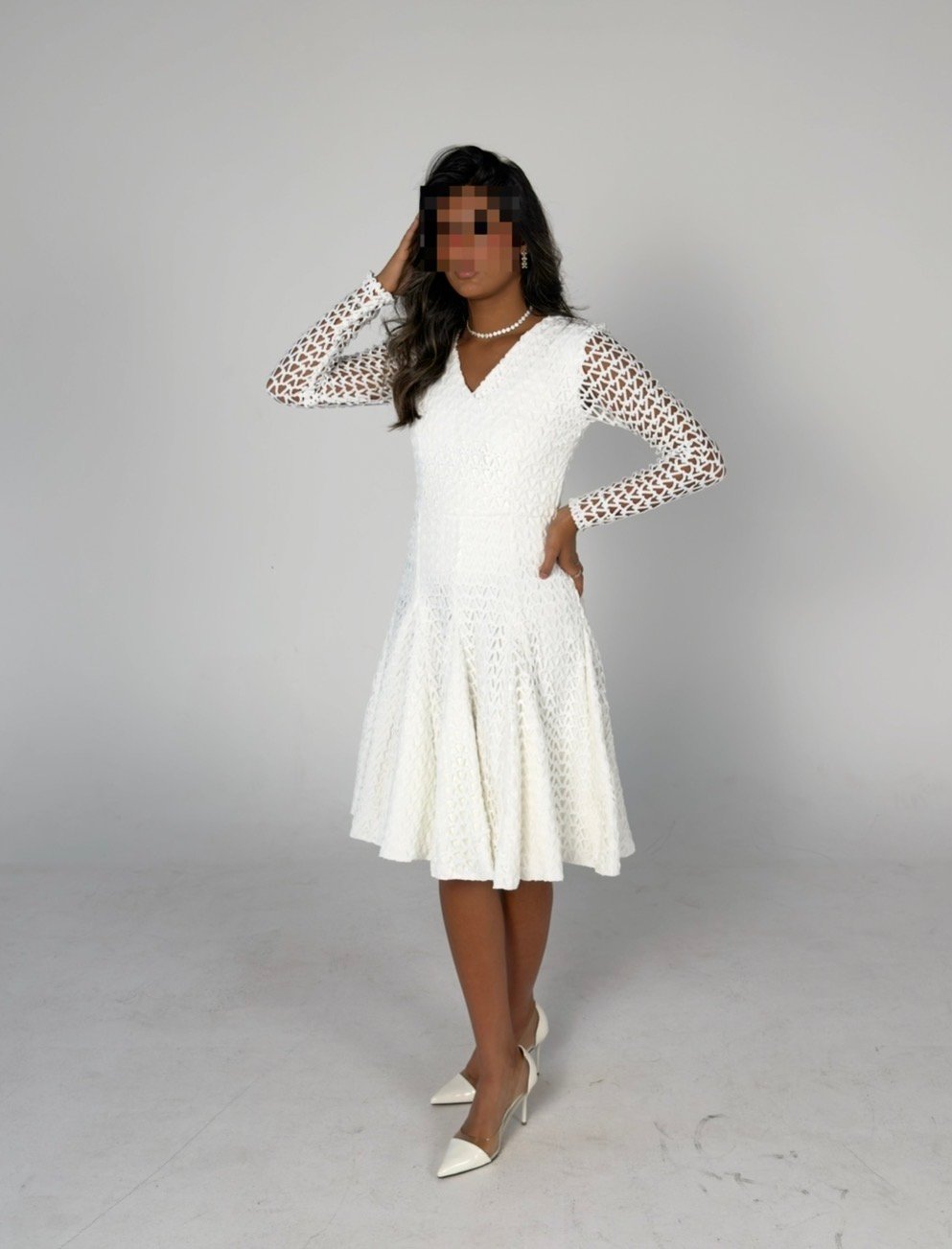 White dress with delicate textured embroidery, long sleeves, and a classic V-neckline. A chic and versatile design, perfect for both daytime and evening occasions.